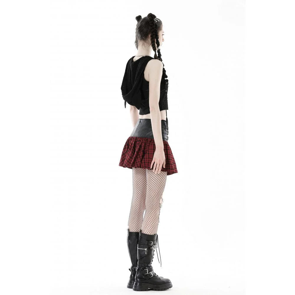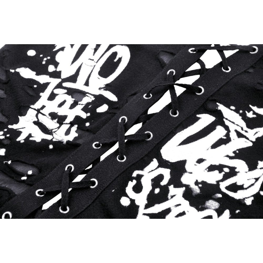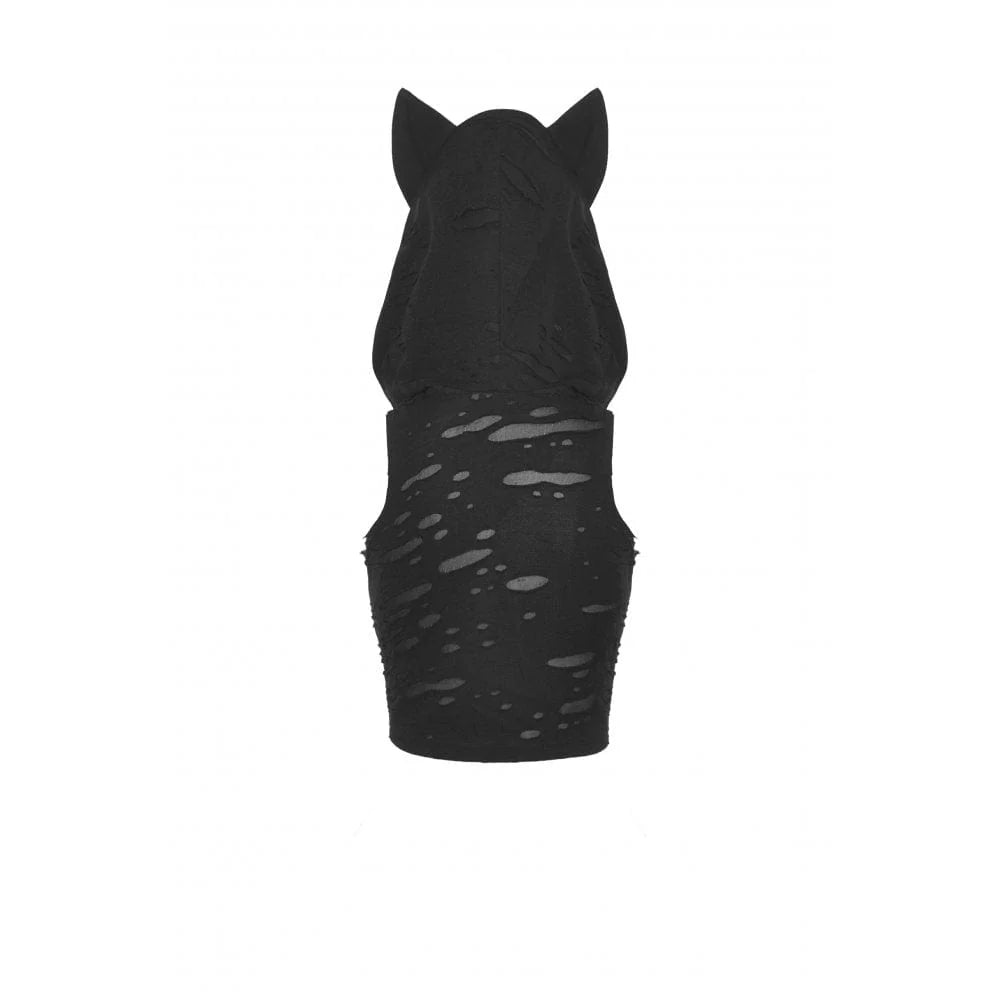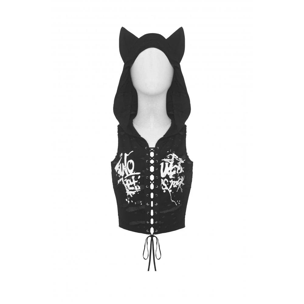 Fallen Angel is a gothic women's sleeveless crop top crafted from distressed black fabric with a slim, fitted silhouette. It features a hood with playful cat ears and an adjustable lace-up front for a custom fit. Made with super elastic fiber for comfort and style. Available in sizes XS to XXL.