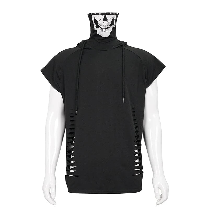 Summoning is a bold gothic men's top designed for those who thrive in darkness. Featuring a striking skull face print, distressed shredded jersey fabric, and studded jawline detail, this hooded sleeveless top makes a fierce statement. Crafted from a soft cotton-polyester blend, it offers both edge and comfort. Available in sizes S to 4XL.