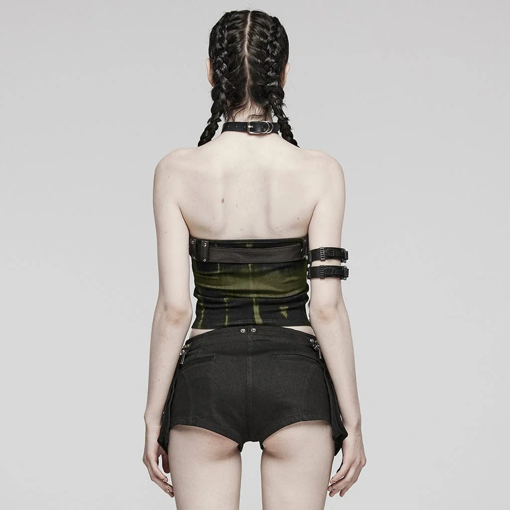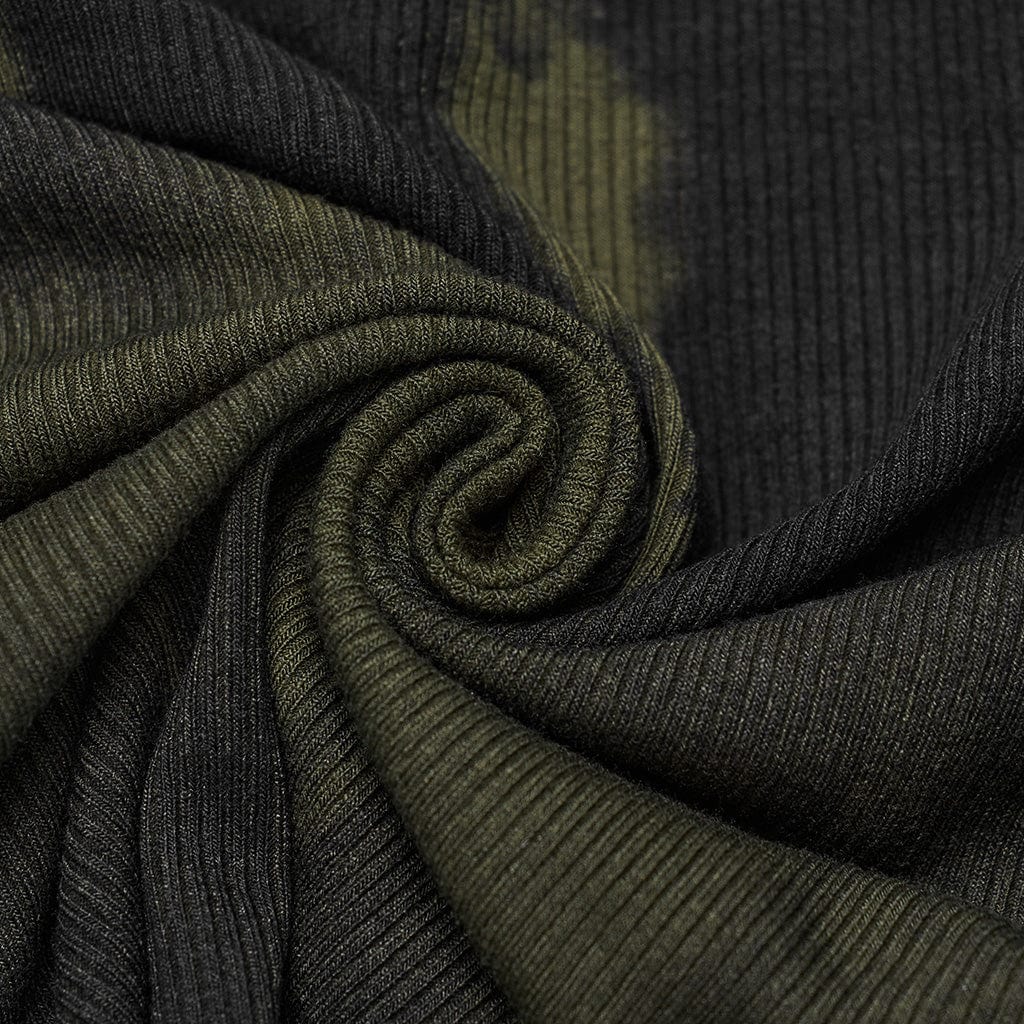 The Boomslang Encounter top blends venomous charm with gothic edge. This slim-fitted tube bustier is made from olive green ribbed stretch fabric with a grungy texture, and it’s punctuated by a black buckle belt along the neckline for a statement look.